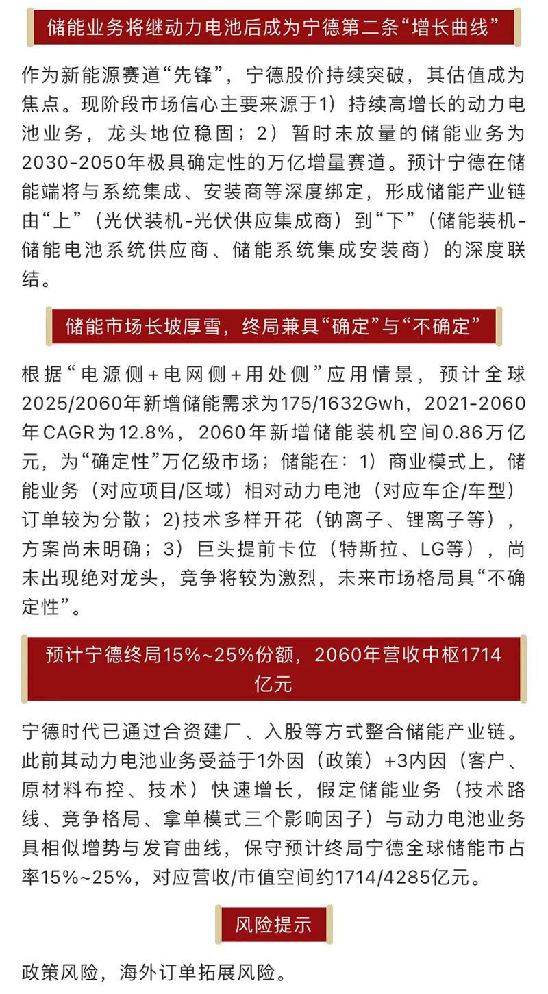 新能源的火热在卖方研究市场也得到了直观体现。日前,华南地区一大型券商研究所发布研报《宁德时代系列之二——储能篇:第二“增长曲线”的终局探讨》,预计储能业务将成为宁德第二条“增长曲线” ,并直接对宁德时代这一业务到2060年的营收中枢给出了预测,约为1714亿元。