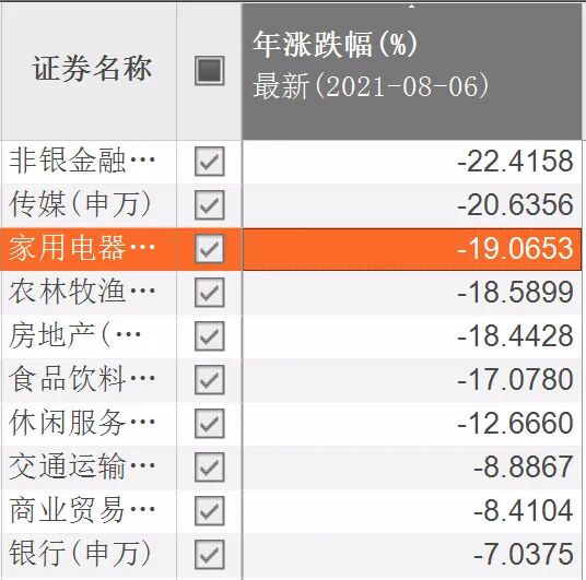 Choice数据显示,截至8月6日,申万家用电器指数今年以来下跌逾19%,在申万28个一级行业指数中跌幅前三。