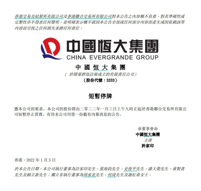 中国恒大于港交所公告称,本公司的股份将由2022年1月3日上午9时正起于香港联合交易所有限公司短暂停止买卖,有待本公司刊发一份载有内幕消息的公告。港股市场上,恒大系股票低开高走。恒大汽车先抑后扬,一度跌超9%,午后恒大汽车涨超10%。恒大物业由绿翻红。恒腾网络直线拉升,截至13时32分,恒腾网络涨超8%。