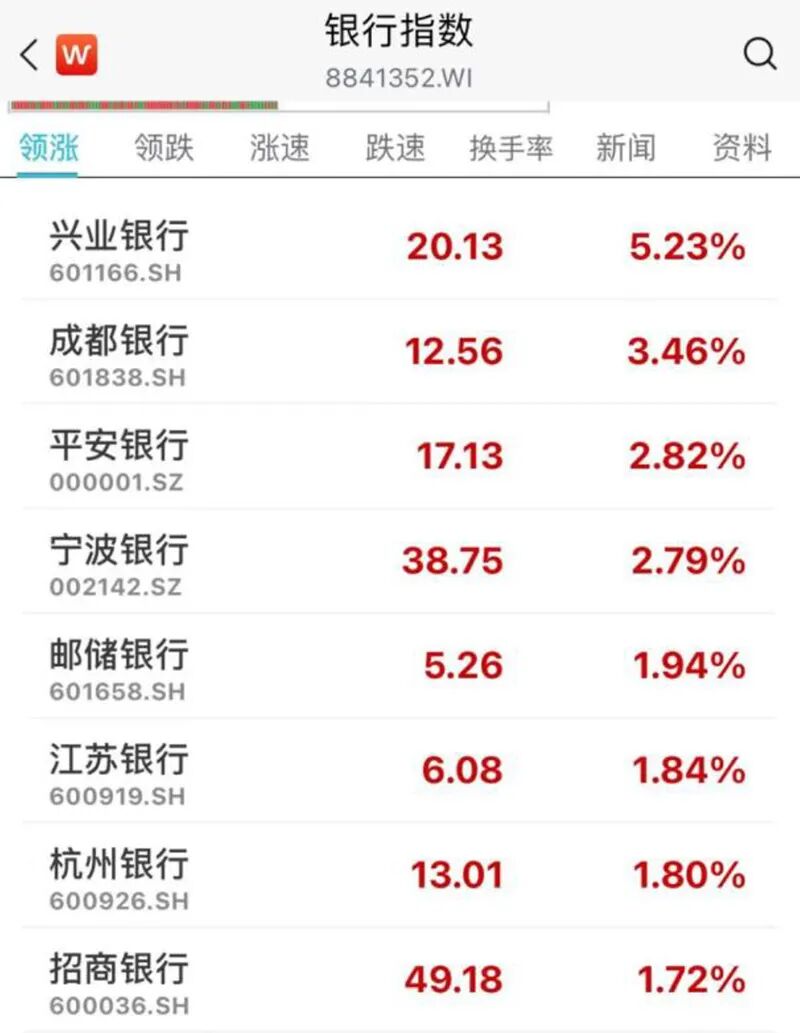 1月5日,银行板块急速拉升,兴业银行涨超5%,成都银行、平安银行、宁波银行领涨。