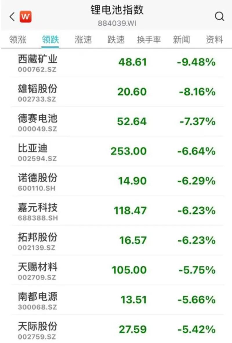 新能源汽车板块全线下跌,法拉电子跌逾8%,德赛电池、天赐材料等纷纷跟跌;锂电池概念,西藏矿业跌超9%,比亚迪跌逾6%,宁德时代跌逾4%。