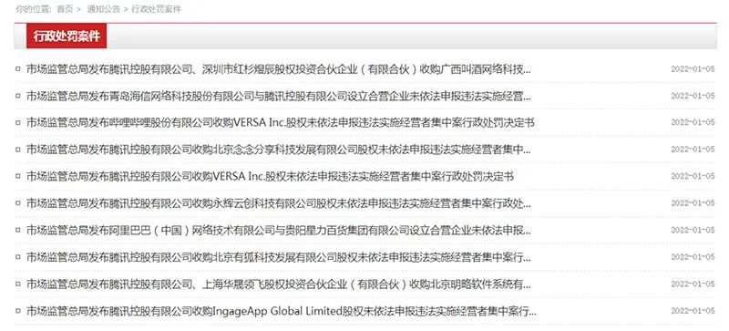 今天上午,市场监管总局又公布一批未依法申报违法实施经营者集中案件立案调查的处罚结果,腾讯、阿里、哔哩哔哩等公司均在列,相关案件的涉案企业分别被处以50万元罚款。