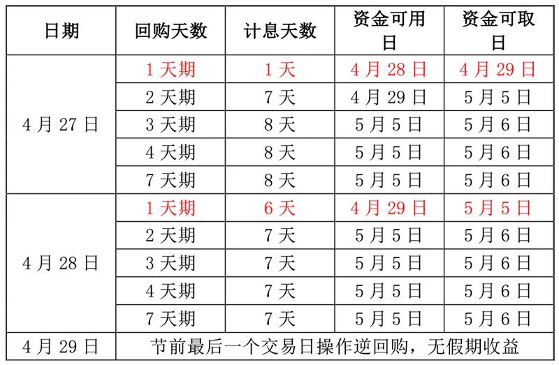 小长假前,场内逆回购的计息天数相应延长。结合今年“五一”假期的放假安排,今明两天是目前仅存的最佳操作时间,两次操作合计赚到7天的利息,而且还完全不影响股票交易。