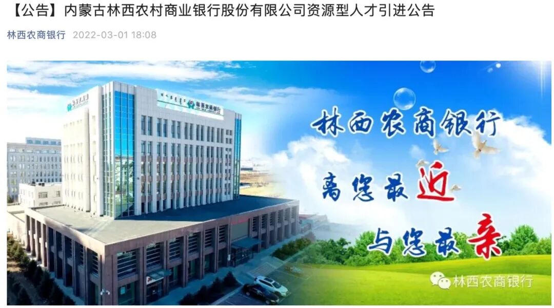 4月18日,内蒙古林西农商行在其官方公众号发布一则关于引进资源型人才入围人员公告,公示了5名资源型人才的个人信息及笔面试成绩,并注明入围人员要在10日内存入不低于1000万元存款,并开具存款证实书后才能进入体检环节。