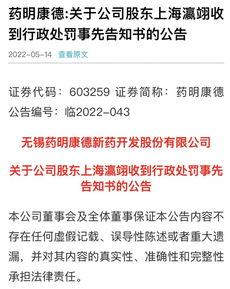 5月13日晚间,药明康德公告称,因减持公司股票涉嫌违法违规,公司股东上海瀛翊收到了行政处罚事先告知书,证监会责令上海瀛翊改正,给予警告,并处以2亿元的罚款。
