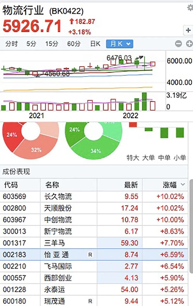 物流板块盘中也出现拉升,中创物流、长久物流、天顺股份相继涨停,新宁物流、怡亚通、上海雅仕、三羊马等纷纷上扬。其中,怡亚通股价从底部反弹已接近翻倍。