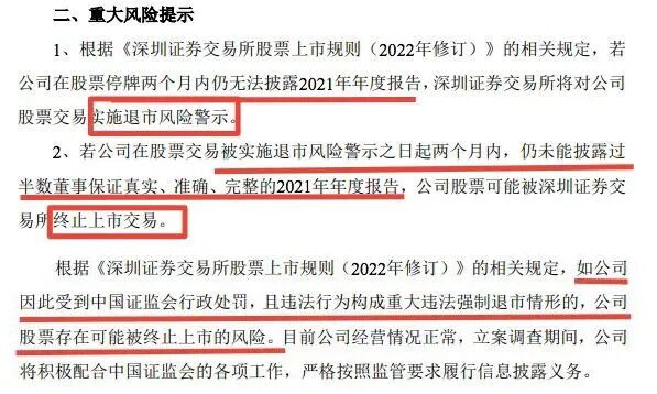 若公司未能在股票停牌两个月内披露2021年年报,将会被实施退市风险警示;若自被实施退市风险警示之日起两个月内,延安必康仍未披露过半数董事保证真实、准确、完整的2021年年报,公司股票将可能被终止上市交易。