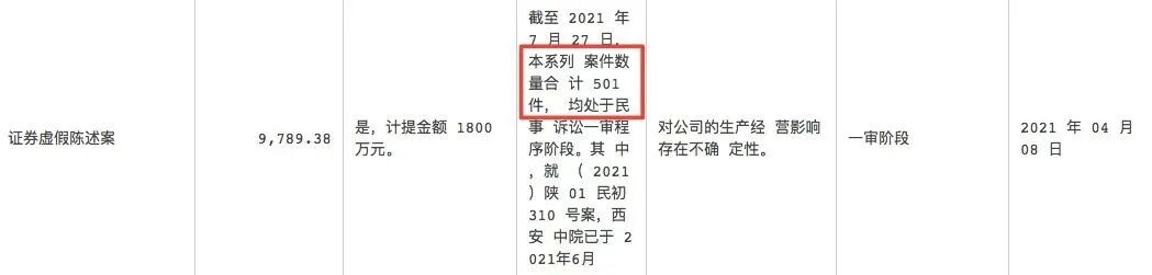 随着公司违法事实的确认,相关权益受损的投资者便陆续向延安必康索赔。延安必康2021年半年报显示,截至2021年7月27日,涉及的证券虚假陈述系列案件合计501件,涉案金额为9789.38万元,均处于民事诉讼一审程序阶段。