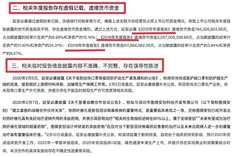 如2020年2月,延安必康前脚说完“收到加快口罩等疫控防护品生产紧急通知”,后脚补充“尚未取得口罩生产许可资质”;前脚说完“与图微安创签署战略合作协议,图微安创已经开发出对新冠重要临床表现之一的肺纤维化,具有良好治疗逆转作用的多肽药物”,后脚又说“目前处于临床前研究阶段”……