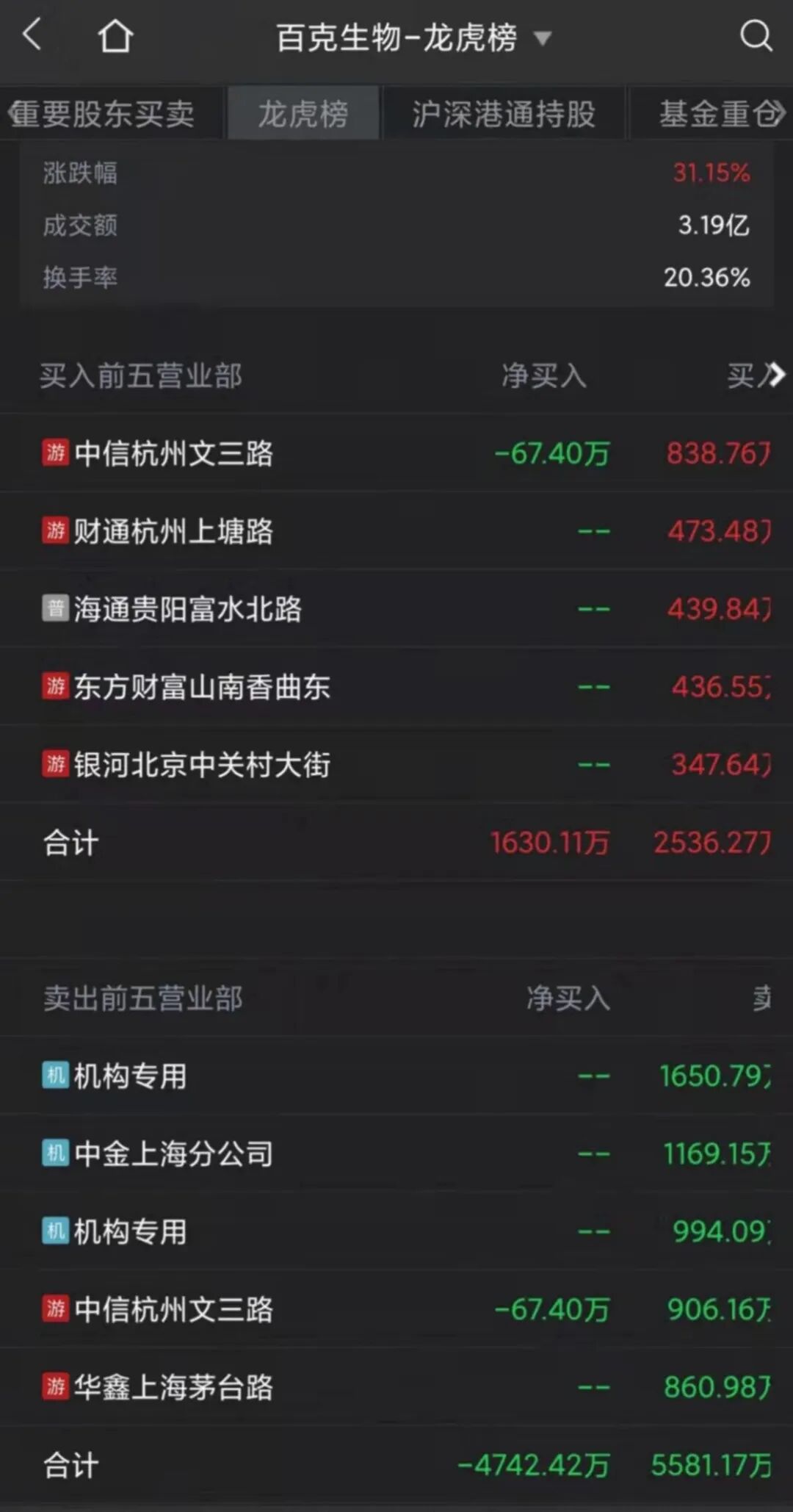 百克生物今日大涨13.74%,部分机构或已趁机卖出。5月23日龙虎榜数据显示,百克生物连续3个交易日内收盘价格涨幅偏离值累计达到30%,其中前五大卖出席位中有两个机构专用席位,同时Wind数据显示,中金上海分公司也是机构席位。