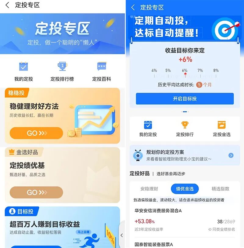 投资者还可选择“涨跌幅定投”等智能定投模式,更灵活合理地投入资金,也可以预设定投目标,达到后会自动提醒。
