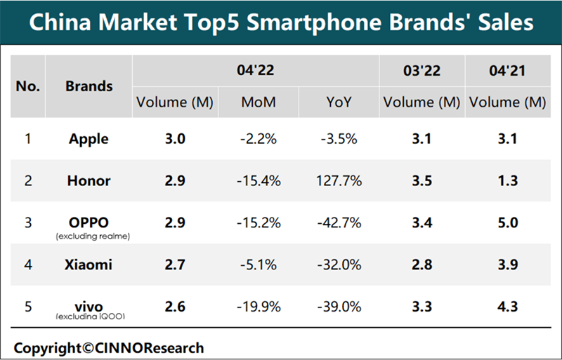 CINNO Research认为,荣耀自身已经完成了品牌重建工作,与2021年相比成绩亮眼,4月份单品榜单上有4款产品上榜,分列第4、5、6、10名。但荣耀4月销量环比降幅也在15.4%左右,与其他品牌基本处于同一水平。