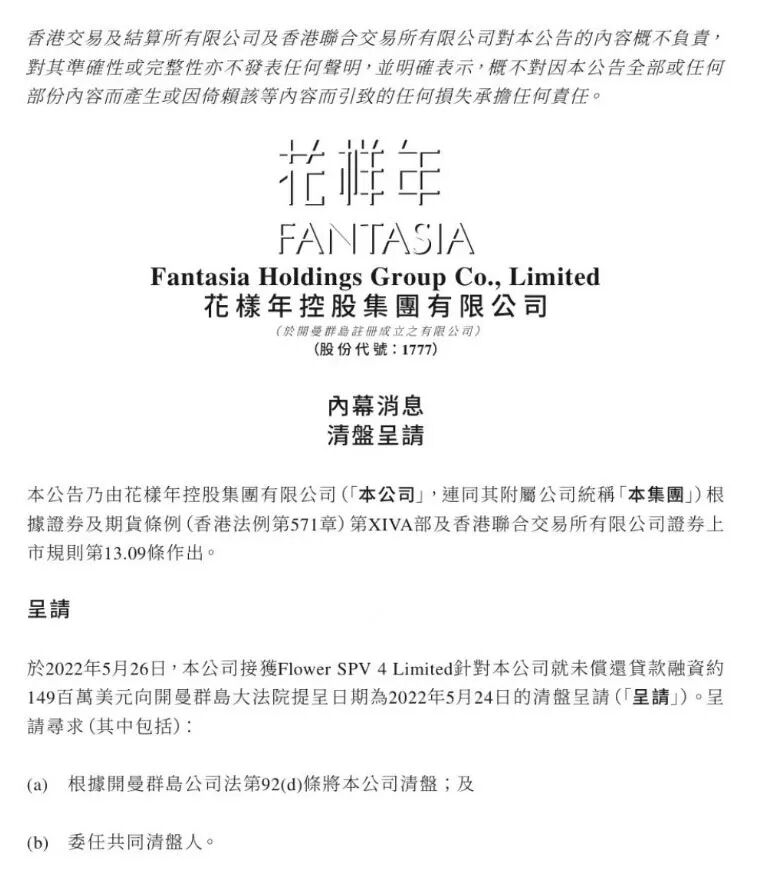 5月30日,花样年控股在港交所发布公告称,公司接获Flower SPV 4 Limited 针对该公司就未偿还贷款融资约1.49亿美元向开曼群岛大法院提呈日期为2022年5月24日的清盘呈请。公告显示,上述呈请内容包括将花样年清盘、委任共同清盘人。