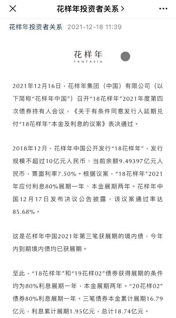 早在去年,花样年已将部分债务成功展期。据花样年投资者关系官微显示,截至2021年12月18日,“18花样年”和“19花样02”债券获得展期,条件均为80%利息展期一年,本金展期两年。“20花样02”债券80%利息展期一年。三笔债券本金累计展期16.79亿元,利息累计展期1.95亿元,总计18.74亿元。