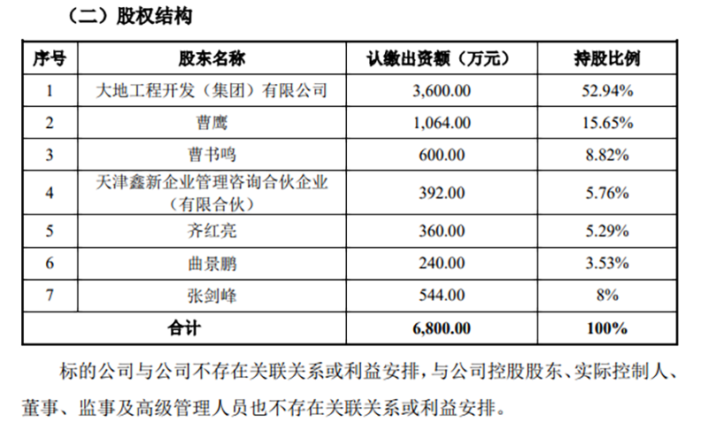 本次交易的交易对方为大地工程开发(集团)有限公司(以下简称“大地集团”)、曹鹰、曹书鸣、张剑峰、天津鑫新企业管理咨询合伙企业(有限合伙)(以下简称“天津鑫新”)、齐红亮、曲景鹏。上述交易对方均与公司不存在关联关系,本次交易不构成关联交易,也不会导致公司控制权的变更。