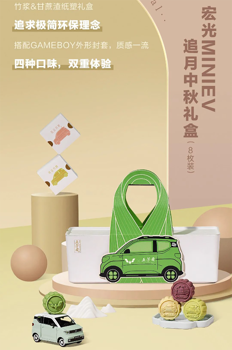 刚上市不久的老字号企业五芳斋近日也携手五菱汽车,推出两款联名月饼礼盒——宏光MINIEV追月中秋月饼礼盒和宏光MINIEV逐光中秋月饼礼盒。