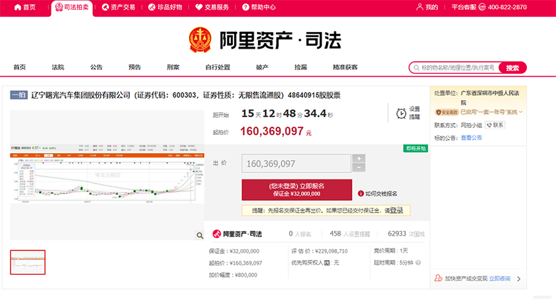 记者注意到,8月31日,京东拍卖公示了这笔拍卖。公示信息显示,辽宁省锦州市中级人民法院将于10月10日起对华泰汽车所持有的9789.5万股ST曙光无限售流通股进行拍卖,起拍价为ST曙光10月10日前20个交易日平均价乘以拍卖总股数所得金额,展示价为4.15亿元。