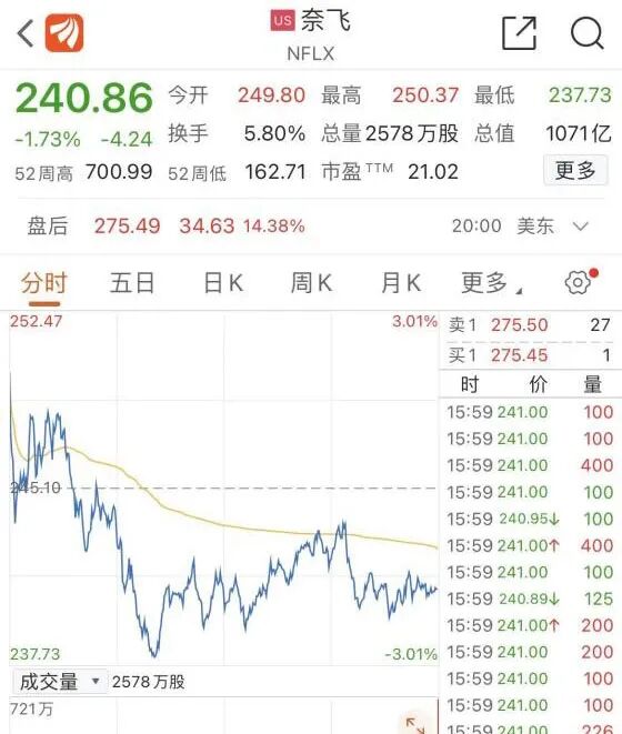 财报发布后,收跌1.73%的奈飞盘后大涨14%,次日盘前涨超12%。