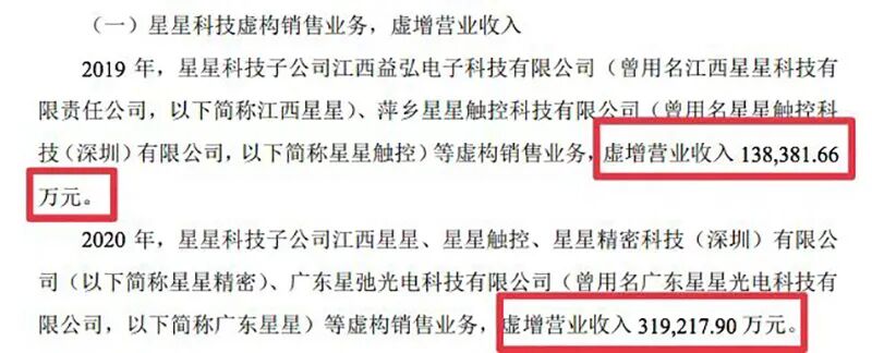 具体来看,*ST星星通过虚构销售业务虚增营收,涉及金额最大。2019年,星星科技子公司江西星星、星星触控等虚构销售业务,虚增营收13.84亿元;2020年,星星科技子公司江西星星、星星触控、星星精密、广西星星等虚构销售业务,虚增营收31.92亿元。