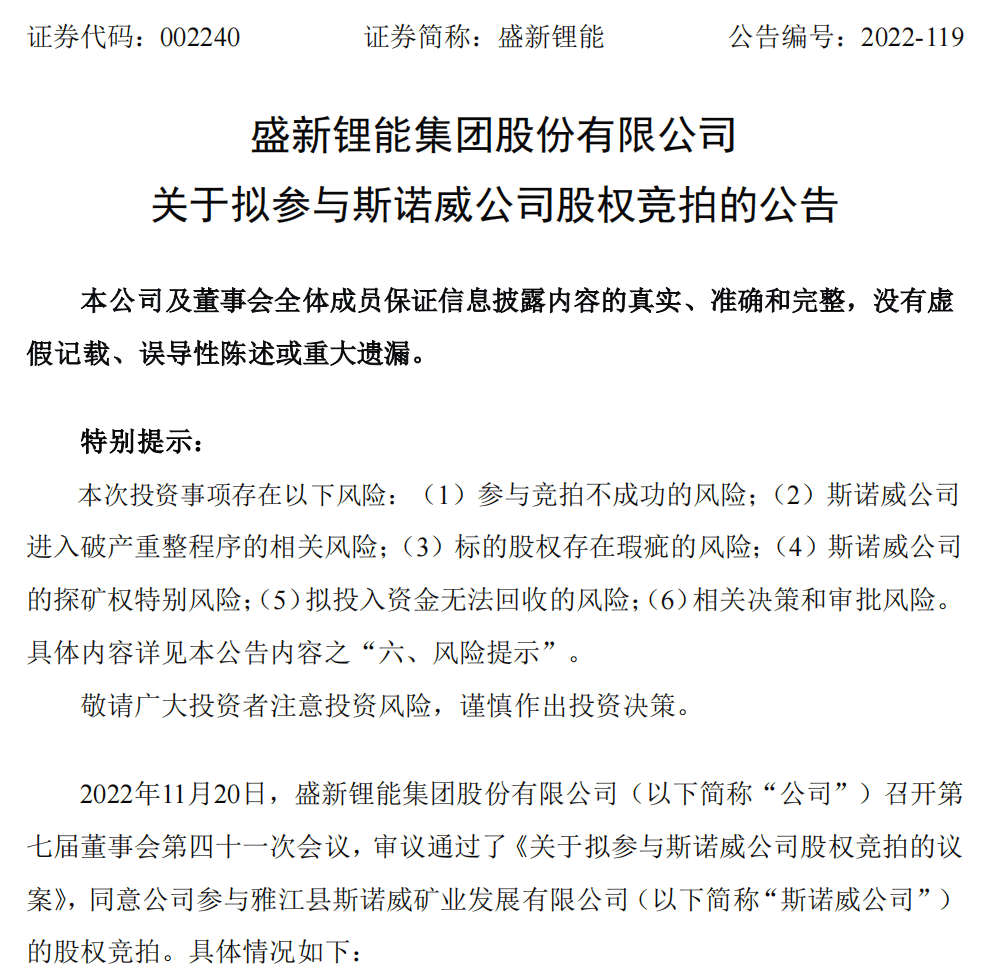 最新公告显示,锂矿巨头——盛新锂能决定出手,一方面有意参与竞拍雅江县斯诺威矿业发展有限公司(下称“斯诺威”)相关股权,一方面打算参与斯诺威的破产重整。