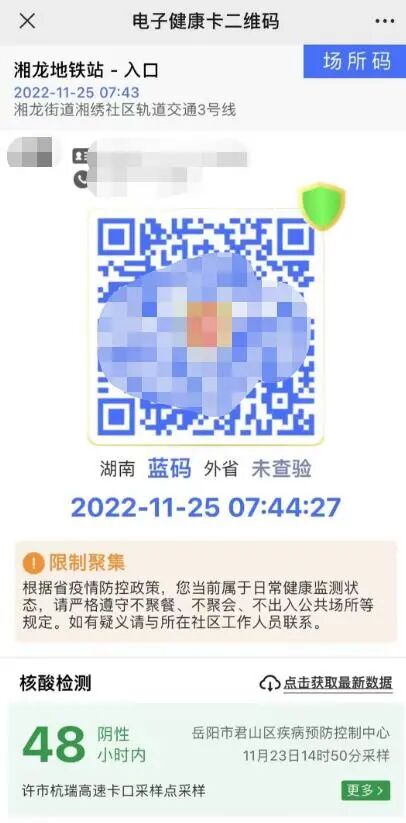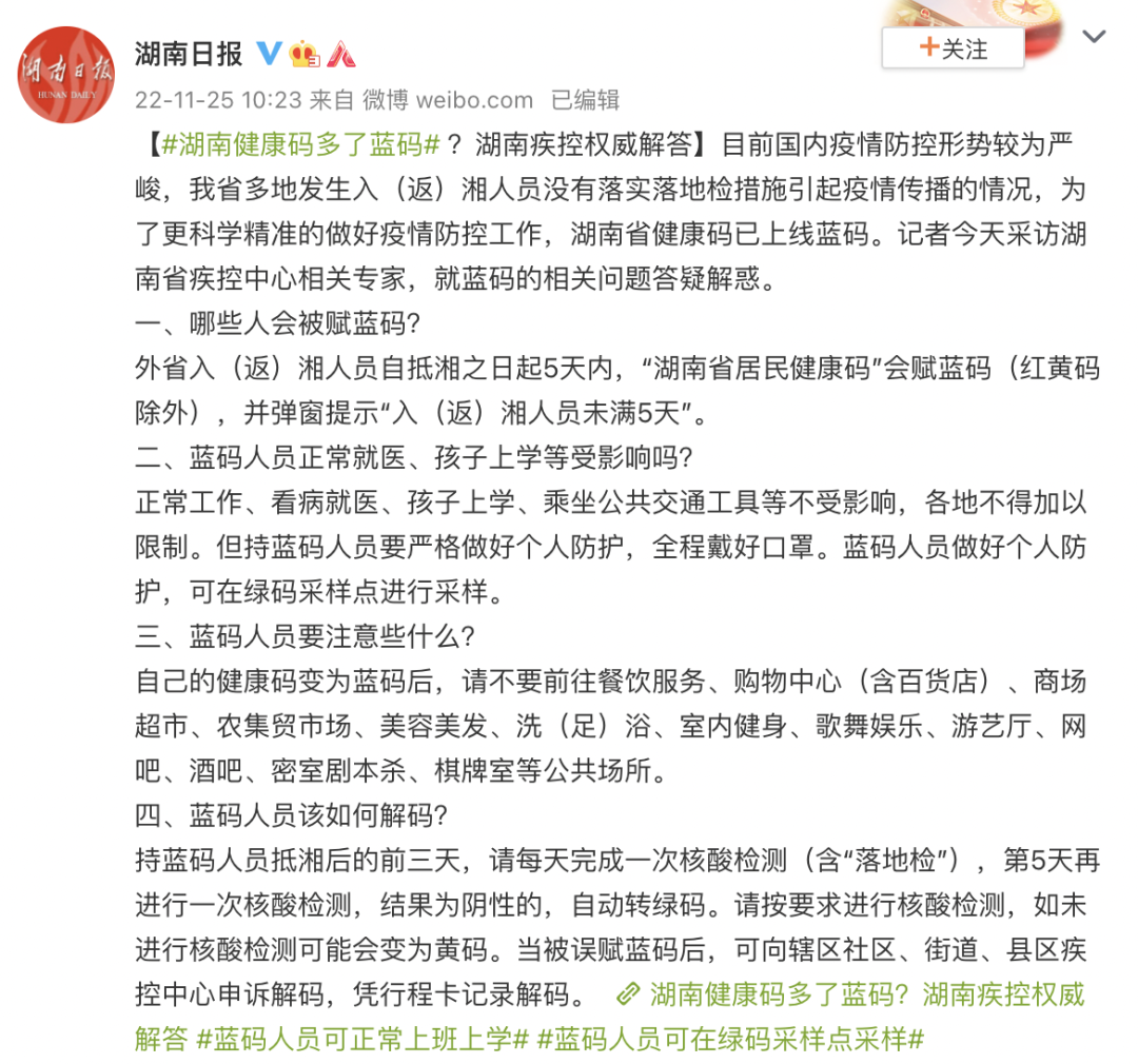 11月25日,湖南省健康码上线了“蓝码”。