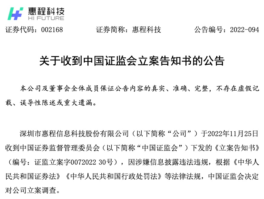 11月26日晚,惠程科技发布公告称,公司于11月25日中国证监会下发的《立案告知书》,因涉嫌信息披露违法违规,根据《中华人民共和国证券法》《中华人民共和国行政处罚法》等法律法规,中国证监会决定对公司立案调查。