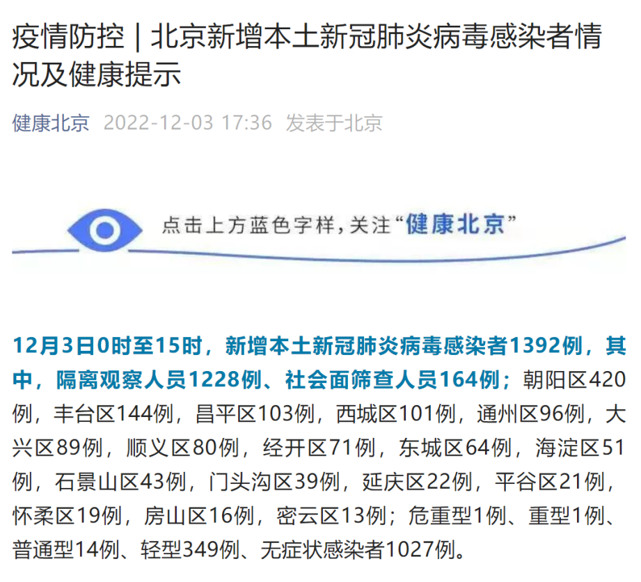 12月3日0时至15时,北京新增本土新冠肺炎病毒感染者1392例,其中,隔离观察人员1228例、社会面筛查人员164例;朝阳区420例,丰台区144例,昌平区103例,西城区101例,通州区96例,大兴区89例,顺义区80例,经开区71例,东城区64例,海淀区51例,石景山区43例,门头沟区39例,延庆区22例,平谷区21例,怀柔区19例,房山区16例,密云区13例;危重型1例、重型1例、普通型14例、轻型349例、无症状感染者1027例。