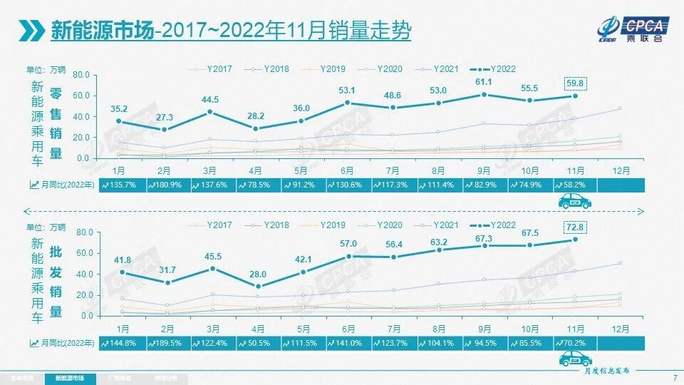 乘联会数据还显示,11月新能源乘用车批发销量达到72.8万辆,同比增长70.2%,环比增7.9%。2022年1-11月新能源乘用车批发574.2万辆,同比增长104.6%。11月新能源乘用车零售销量达到59.8万辆,同比增长58.2%,环比增7.8%,1-11月保持趋势性上升走势。1-11月新能源乘用车国内零售503.0万辆,同比增长100.1%。