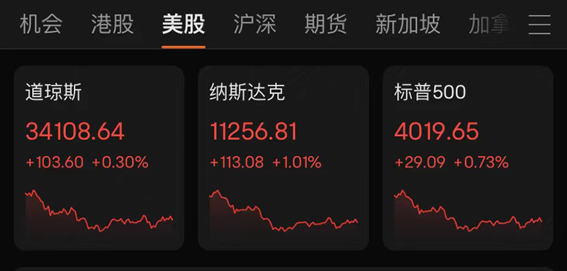 截至收盘,道指收涨103.60点,涨幅为0.30%,报34108.64点;纳指涨113.08点,涨幅为1.01%,报11256.81点;标普500指数涨29.09点,涨幅为0.73%,报4019.65点。
