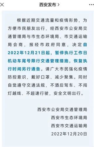 12月21日,北京宣布自12月22日起,暂缓实施机动车工作日高峰时段区域限行的交通管理措施(即尾号限行措施)。后续,将结合疫情发展变化和道路交通情况,及时研判恢复尾号限行措施的日期,并提前一周予以通告明确。