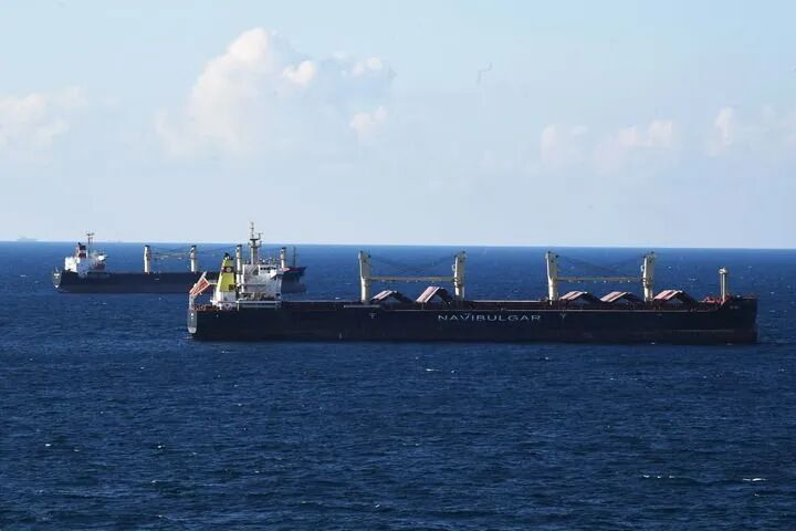8月6日,从乌克兰出发的第二批运粮船抵达土耳其伊斯坦布尔的博斯普鲁斯海峡黑海入海口附近。新华社记者 沙达提 摄