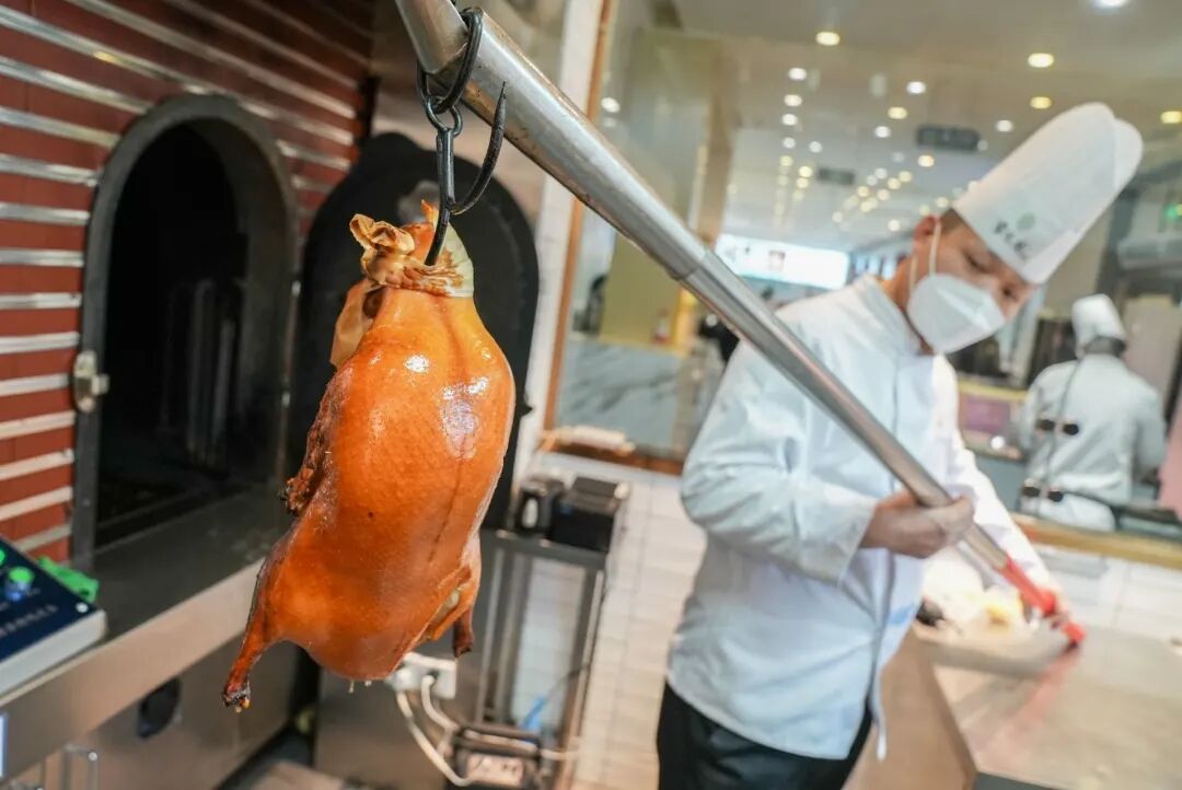 到了周末,正餐门店成为家庭聚餐的首选。24日中午12点,紫光园团结湖店里已经座无虚席,几张8人大桌都已经坐满。推开店门走进温暖的室内,烤鸭的香气扑面而来,眼镜片上瞬间蒙上一层薄雾。片鸭师傅们推着小车穿梭在餐桌边准备鸭肉,食客们则在席间把酒言欢。“开心极了!”正和全家老小一起吃生日宴的市民王奶奶高兴地说,自己已经好久没出门“下馆子”,“真是盼了好久了”。