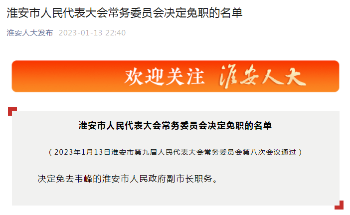 1月13日,江苏省淮安市第九届人民代表大会常务委员会第八次会议通过决定,免去韦峰的副市长职务。