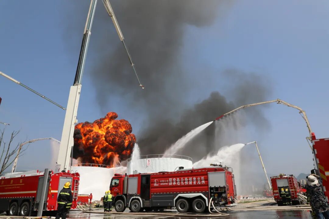 ▲在危险化学品储罐泄漏爆炸灭火处置科目中,中石化中原油田普光分公司联合四川省消防救援总队负责储油罐区(6个5000m³汽油罐组)扑救地面流淌火、罐体灭火与控制、高喷消防车供水等内容。