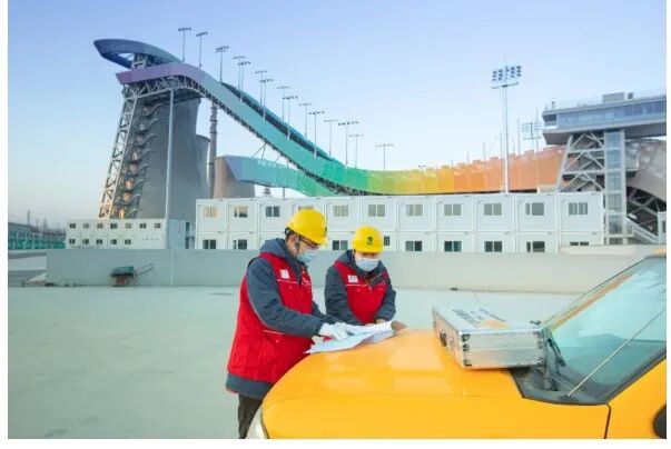 ▲国网北京电力员工在首钢滑雪大跳台中心现场踏勘