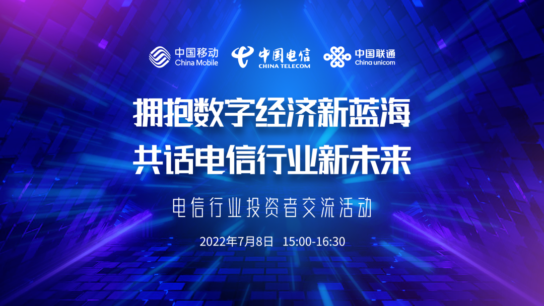 7月8日,由中国电信、中国联通、中国移动三家电信央企联合举办,以“拥抱数字经济新蓝海,共话电信行业新未来”为主题的电信行业上市公司投资者交流活动,通过现场与网络互动的形式举行。这是央企同行业上市公司联合组织投资者交流活动的首次实践,以及运用前沿技术创新投资者交流形式的首次尝试。