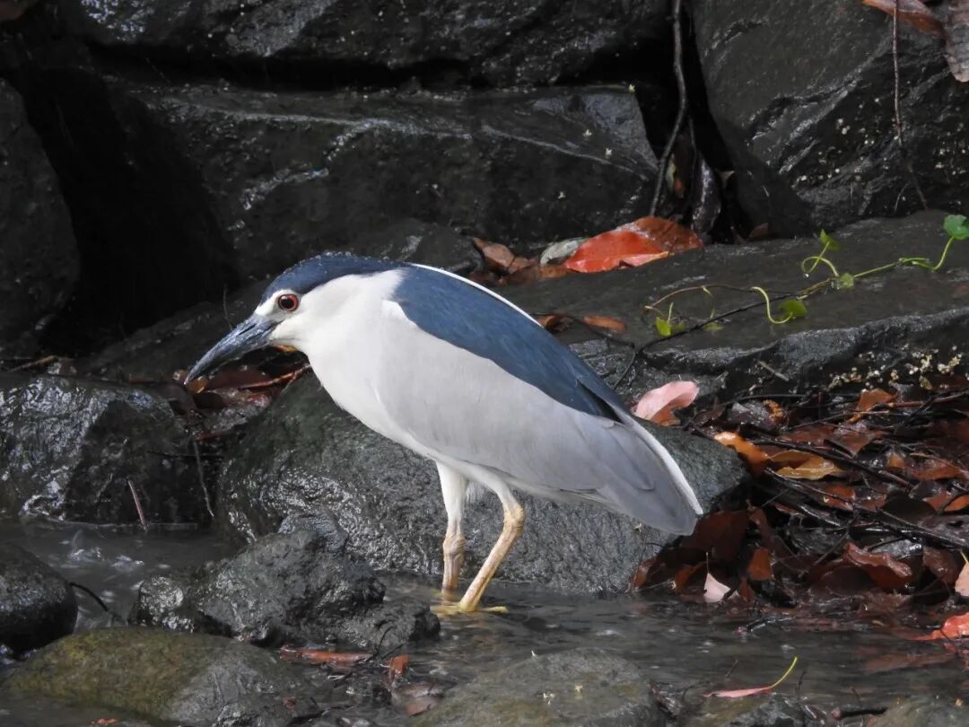 特点:有蓝黑色的头和背部及灰白色的腹部,繁殖期头顶有两根白色的羽毛;白天会站在水边发呆,夜晚开始活跃起来