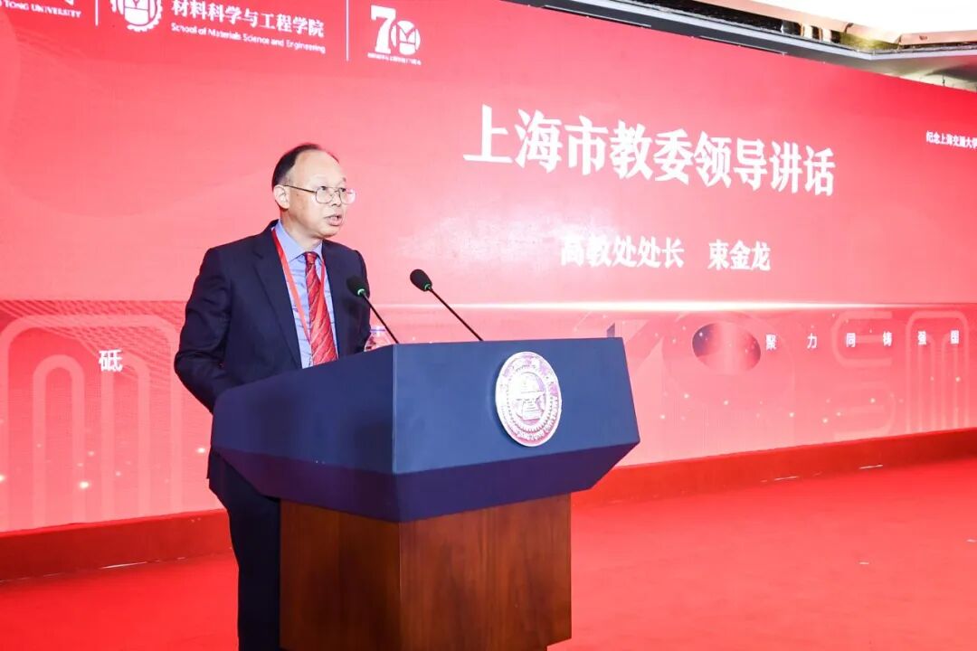 上海市教委高教处束金龙处长向大会表示祝贺。他肯定交大材料学院70年来为党和国家培养出一批批理想信念坚定、专业素养过硬的高素质、专业化、创新型人才,为我国乃至世界材料科学进步做出了突出贡献。他希望,未来材料学院能肩负起材料强国、科技强国的使命与责任,发挥科技创新的关键和中坚作用。