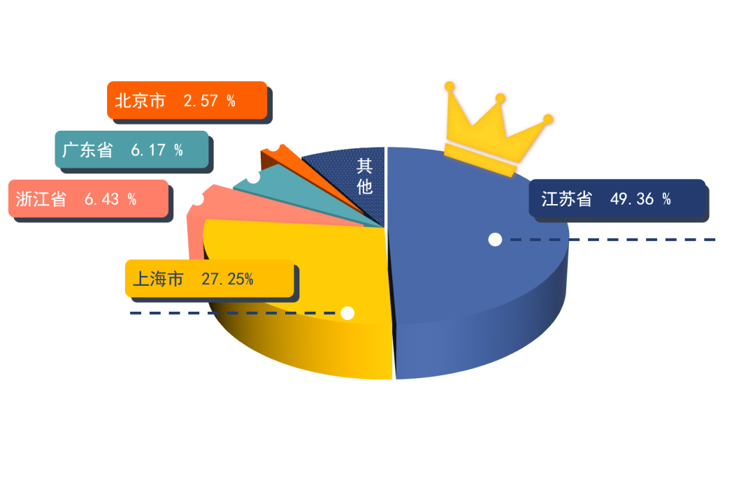 就业省市行政区TOP5分别为:江苏省(49.36%)、上海市(27.25%)、浙江省(6.43%)、广东省(6.17%)、北京市(2.57%)。