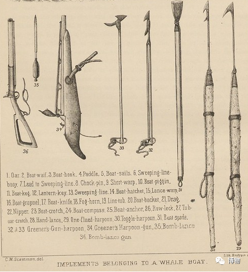 现实中捕鲸作业的工具与电影情节大同小异。几个世纪以来,人们猎杀鲸鱼的武器主要是各式各样的捕鲸叉。早期的捕鲸叉制作简单,由鱼叉、竹竿和绳子组成,只能捕捉小型鲸类。随着捕鲸范围扩张,遨游在远洋的大型鲸鱼也成为目标,原始捕鲸叉的击杀效果不再尽如人意。
