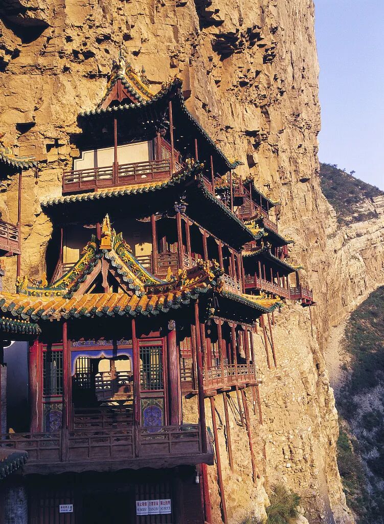 悬空寺以木柱为基础,腾空架在悬崖之上,是国内现存最早、保存最完好的高空木构摩崖建筑。
