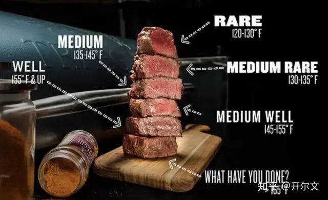 以牛肉为例,在不同的烹饪温度下有不同的状态: