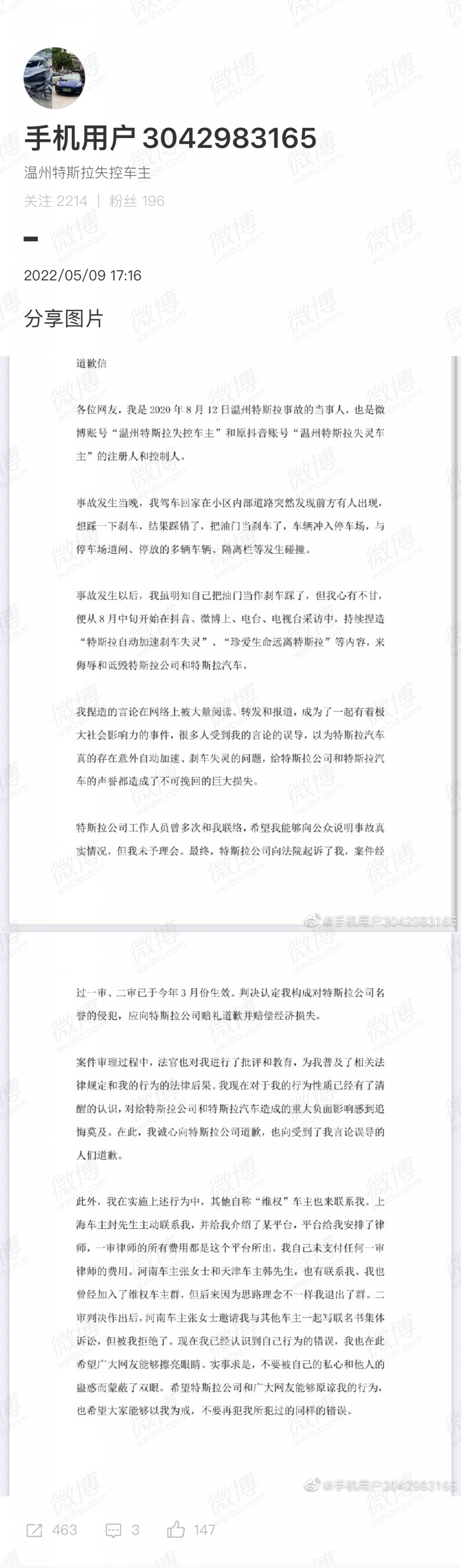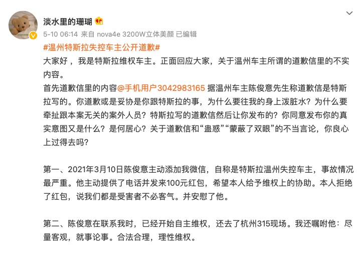 但这事,特斯拉还是出了纰漏。估计他们也没想到,陈某并没有完全按照二审的判决,竟然删除了相关道歉信。