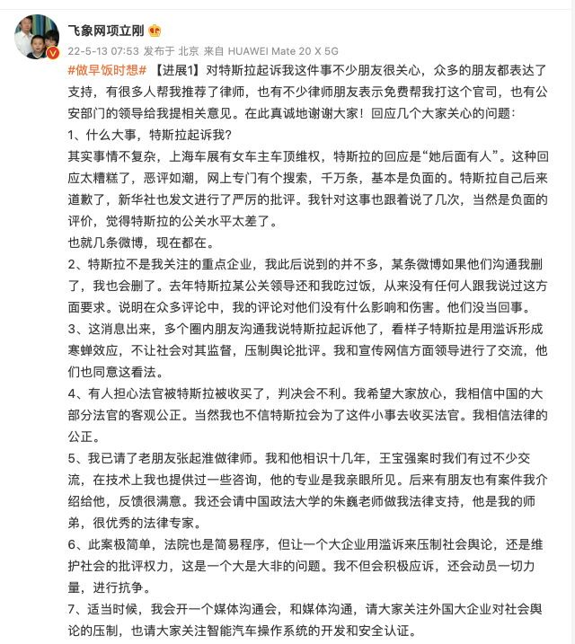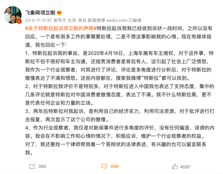 5月12日,项立刚公开回应此事。由于涉及到特斯拉诉讼知名自媒体人,此事又登上热搜。