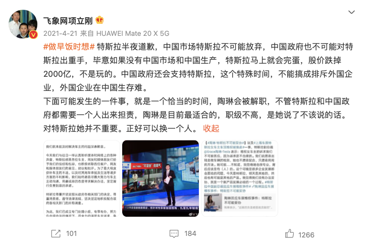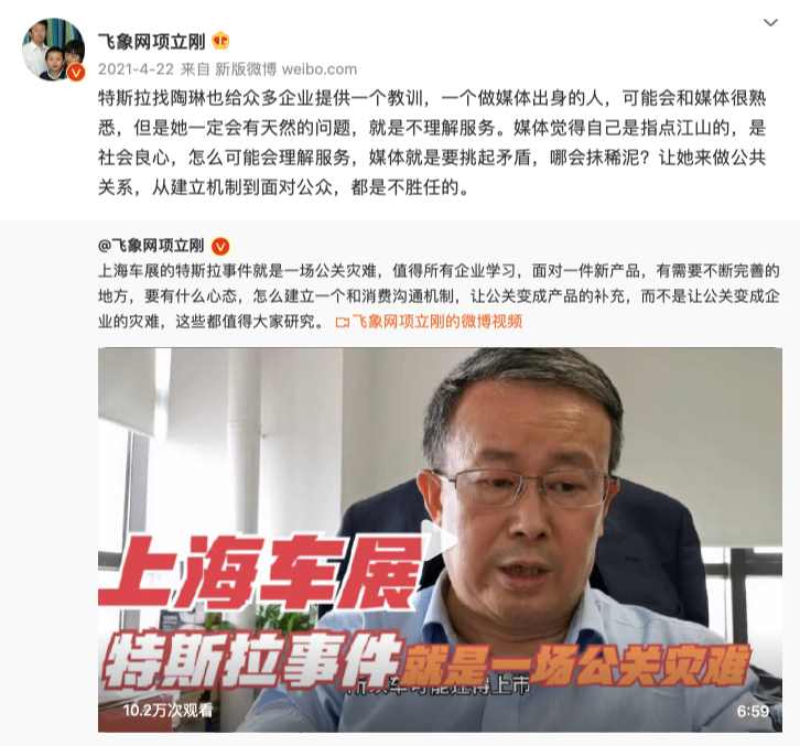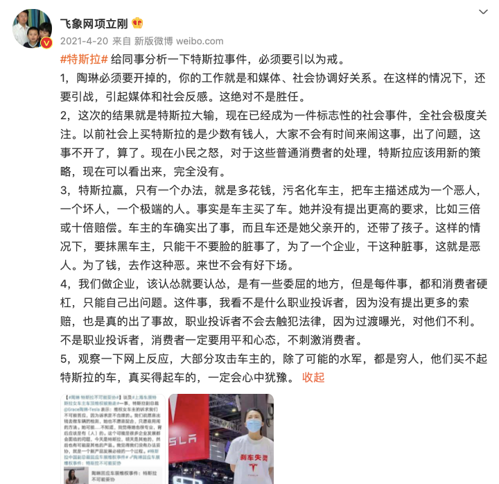 上海车展有女车主车顶维权,特斯拉的回应是“她后面有人”。这种回应太糟糕了,恶评如潮,网上专门有个搜索,千万条,基本是负面的。特斯拉自己后来道歉了,新华社也发文进行了严厉的批评。我针对这事也跟着说了几次,当然是负面的评价,觉得特斯拉的公关水平太差了。