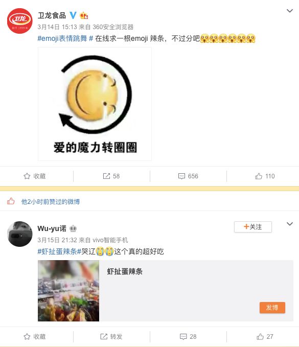 网红食品辣条被曝光,虾扯蛋成为热门话题,大叔挺好奇的,作为辣条届最会营销的卫龙会做借势营销吗?还是悄悄闭嘴?还是主动表个态,加强食品安全问题?截至到今晚的答案是:卫龙给一位网友评价“虾扯蛋辣条好吃”点了一个赞。