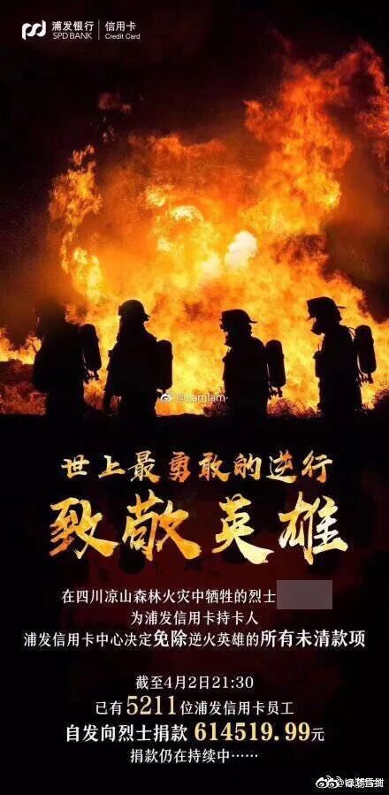 海报的内容是:在四川凉山森林火灾中牺牲的一位烈士***(大叔隐去了),是浦发信用卡的持卡人,后者决定免除这位烈士的所有未清款项。