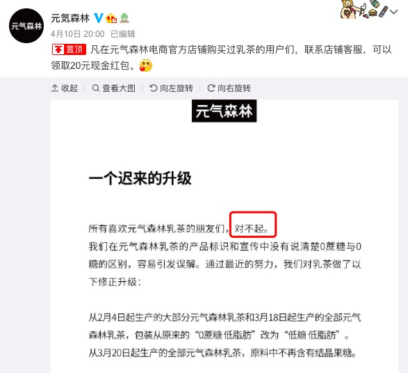 但这一句“对不起”,实际上是官方第一次、正式的,自己颠覆了自己的品牌核心资产,从“0蔗糖”到“低糖”的改变,等于自己打了自己一大巴掌: