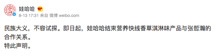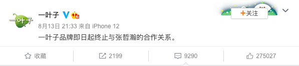 这一次,@娃哈哈 成为第一个公开宣布解约张哲瀚的品牌,而@一叶子 在近30个宣布解约的品牌中,其官宣时间排在倒数前三名。