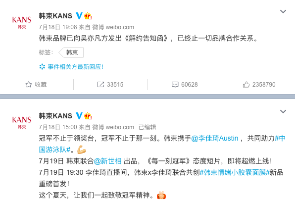 综上,在解约明星这件事上,我可能错夸了韩束,误以为品牌在面对舆情危机时,应该更重视公关价值。